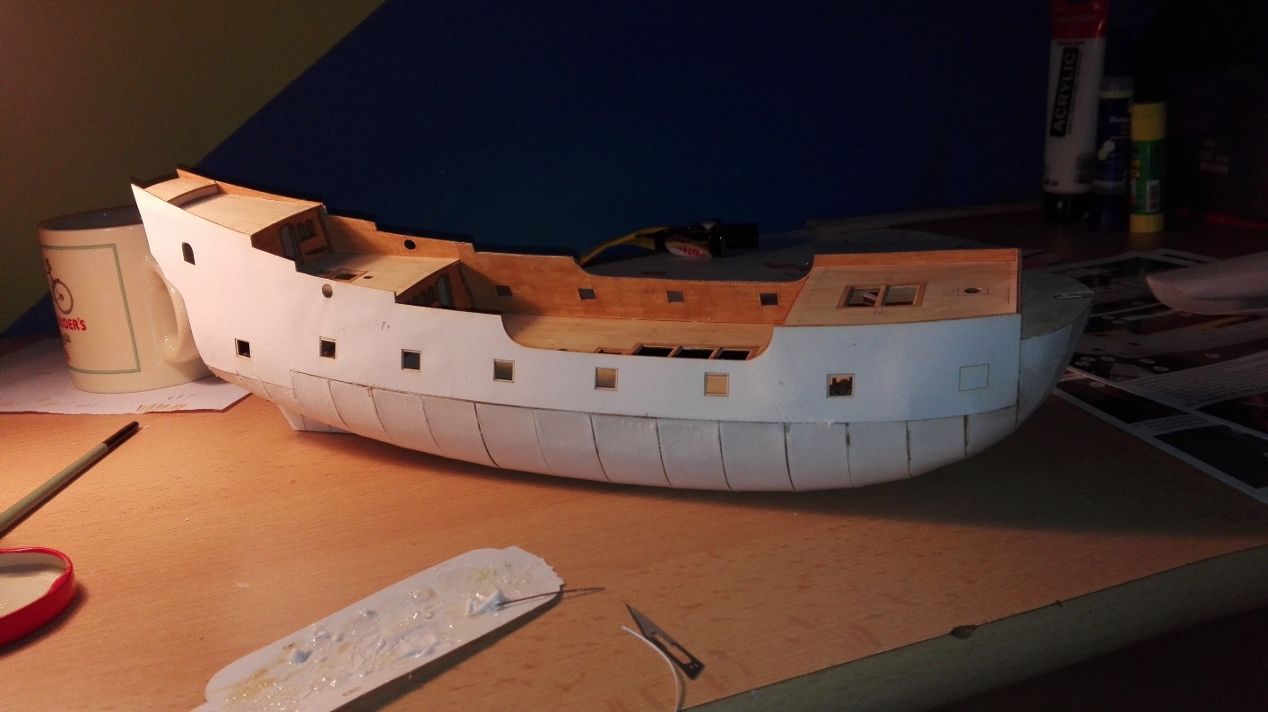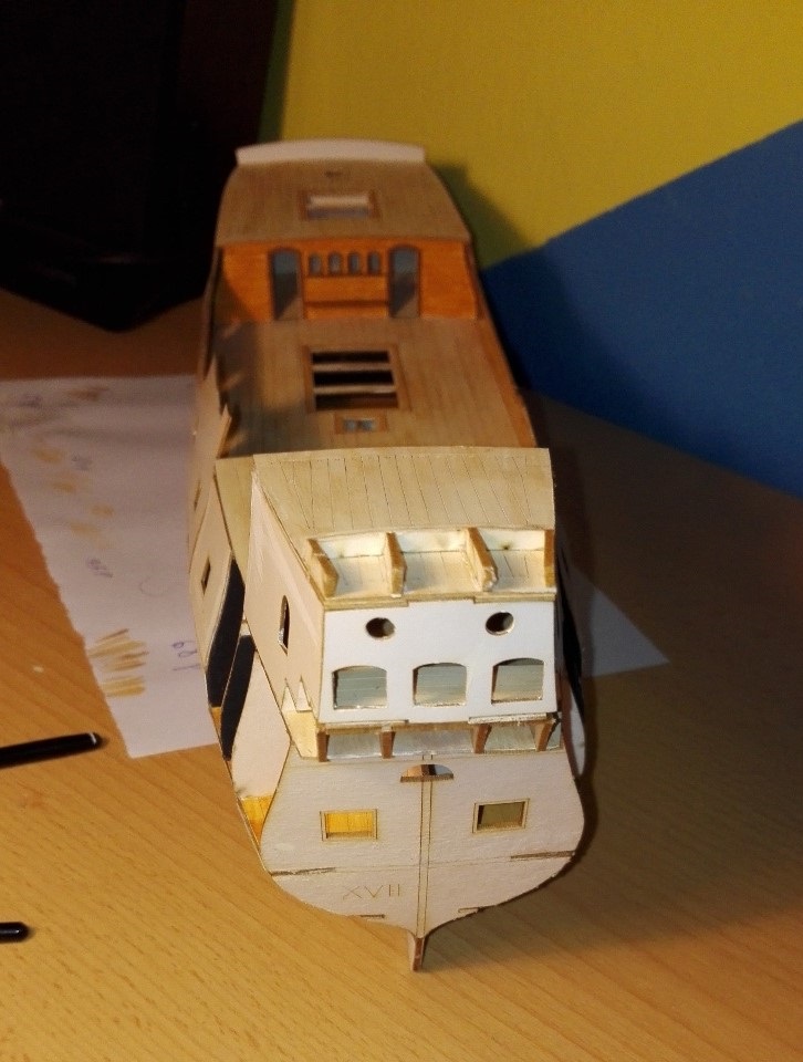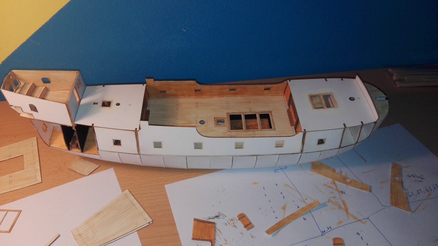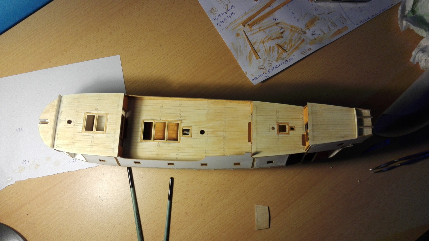 Zapewne pamiętacie, że wszystkie pokłady zostały pomalowane na początku prac(wraz z pierwszym, środkowym pokładem), aby zachować jednolity kolor całości deskowania. Przed przyklejeniem pokładu na najwyższej rufowej części okrętu konieczne było wykonanie i przyklejenie zewnętrznej, pionowej ściany. Na koniec, poprzez umieszczenie po obu stronach elementów burty scalającą całość żaglowca, ukończona została pierwsza warstwa poszycia.