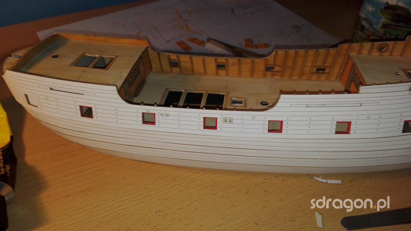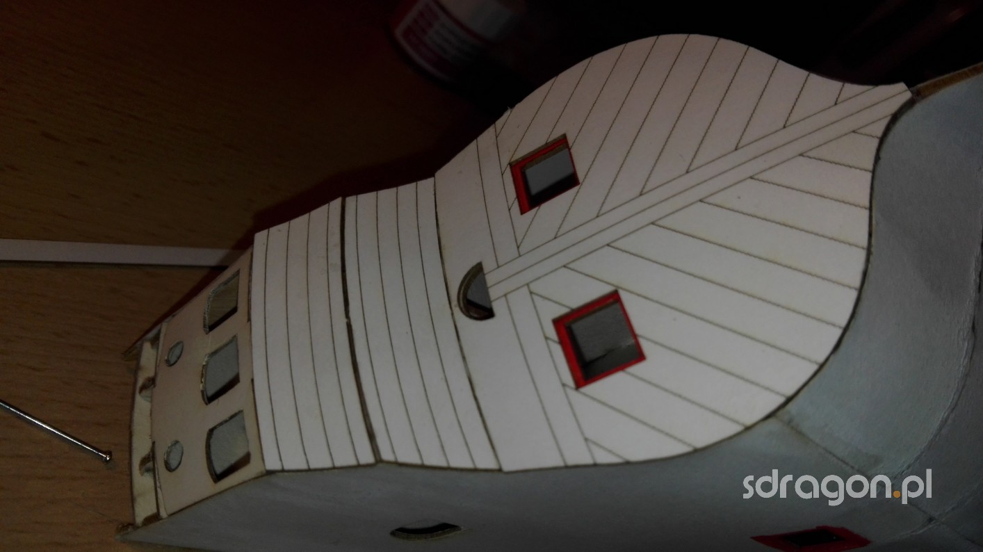 Ukończone zostało także zewnętrzne poszycie okrętu. Na trzecim zdjęciu możemy zobaczyć zabudowaną rufę. Następnie kadłub został oklejony pasami imitującymi układ deskowania. Wiele pracy wymagało dokładne spasowanie furt działowych ze znajdującymi się głębiej warstwami.