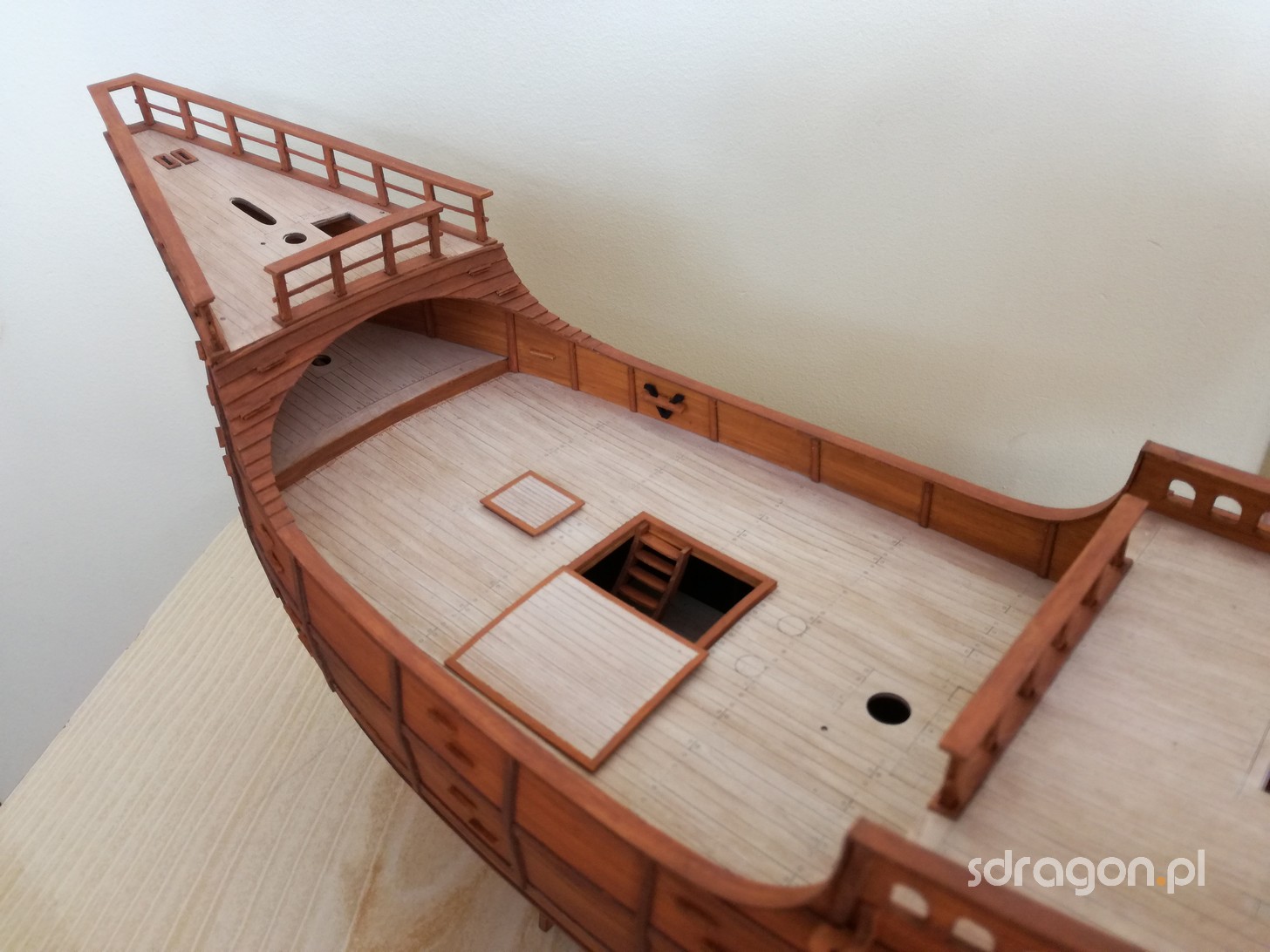 „Kolejnym etapem moich prac było wykonanie: schodków, kotwic, pomp, knag, lawet, kołkownic, zakończenia masztów i marsa, czyli tzw. bocianiego gniazda. Na bokach burt od zewnątrz przykleiłem już wsporniki pod mocowanie lin, a na pokładach włazy i pokrywy zakrywające wejścia pod pokład. Obecnie strugam maszty, reje i flagsztoki.”