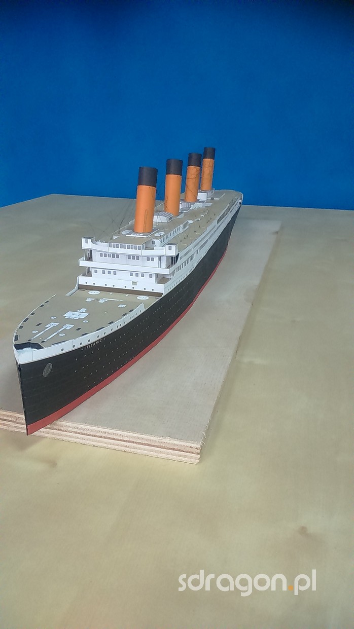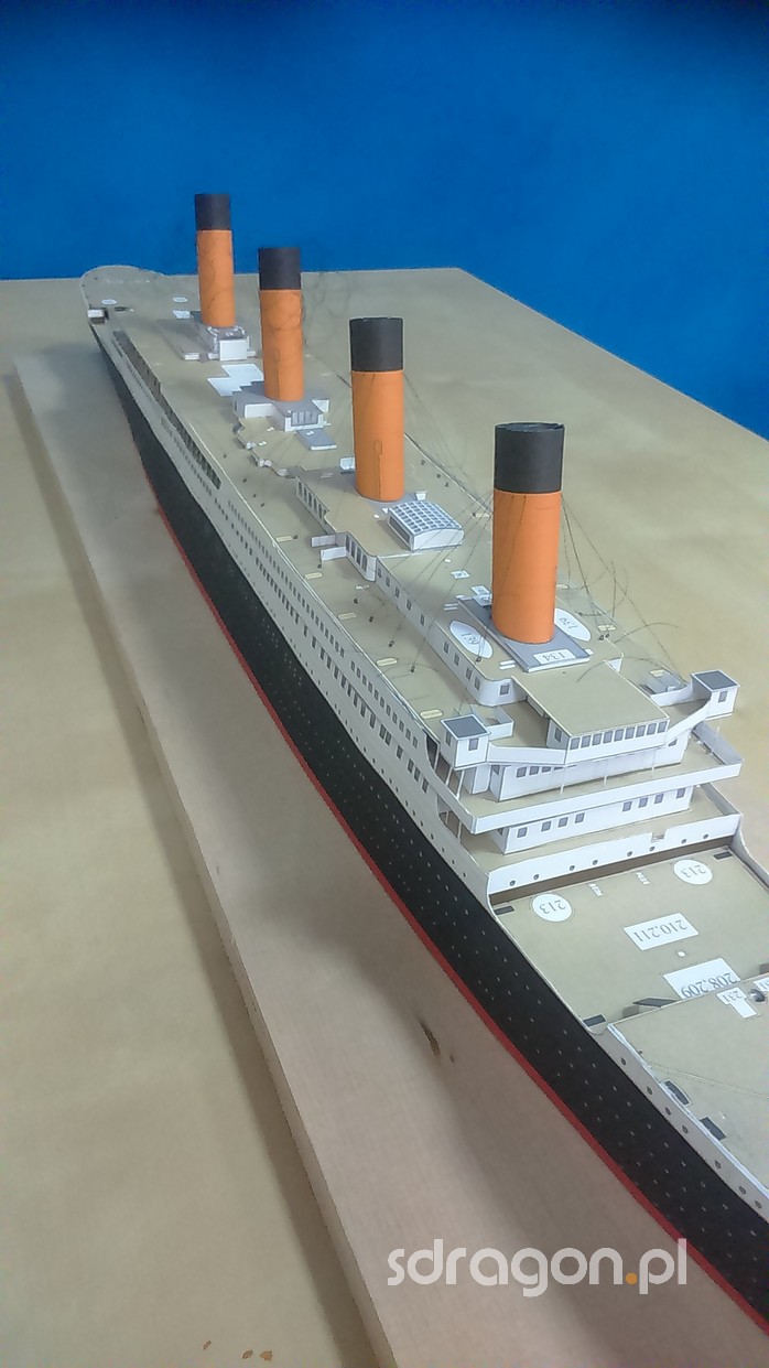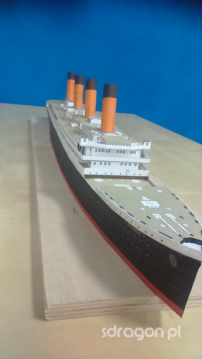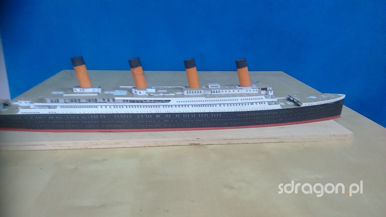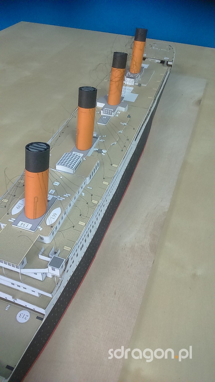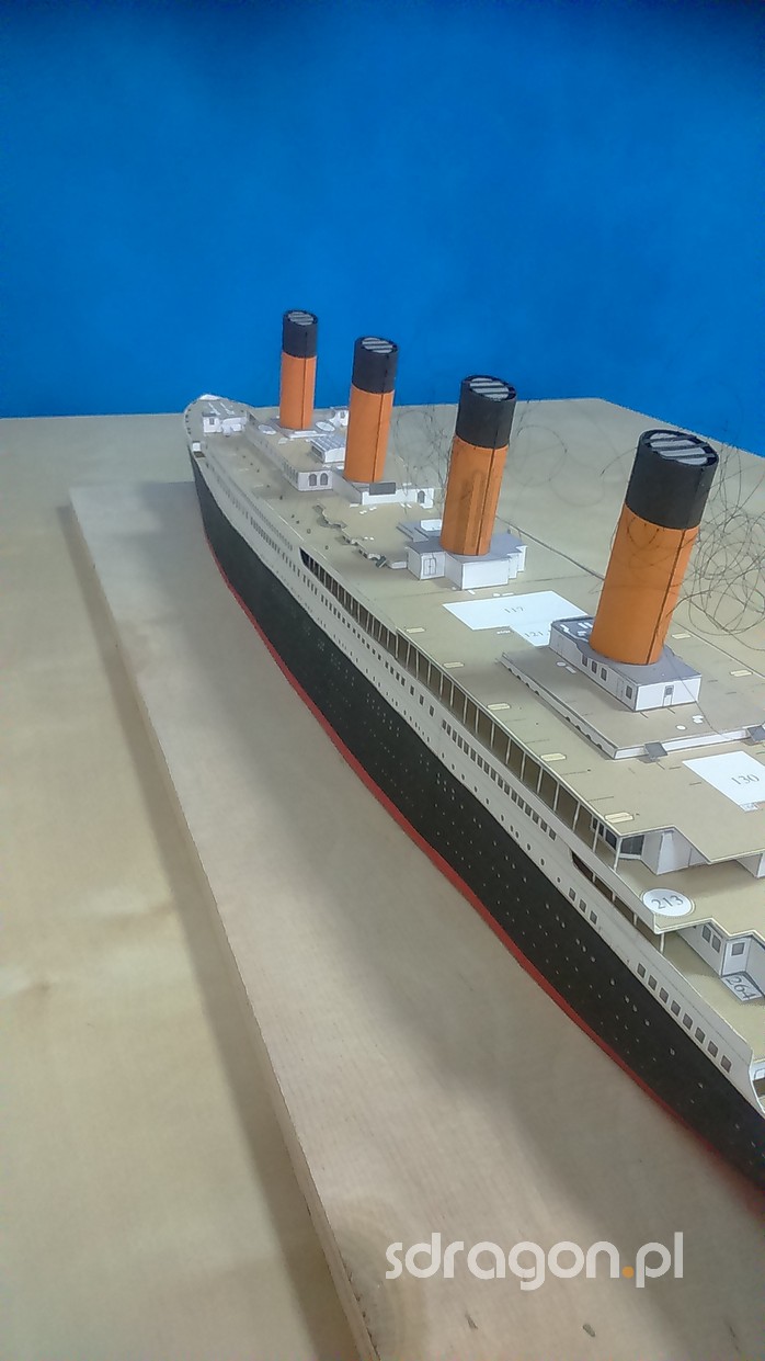 Wspominamy o tym dlatego, że klejony w naszej modelarni Titanic ma już od wczoraj przyklejone wszystkie 4 kominy! W prawdzie zostało jeszcze sporo pracy z umocowaniem odciągów, ale dzięki ostatnim postępom w budowie, ciężko będzie już go pomylić z innym okrętem. Titanic w chwili wodowania nie posiadał praktycznie niczego poza szczelnym kadłubem, niewiele elementów wznosiło się ponad burty. Pomimo to udało się go ukończyć w ciągu niecałego roku. W naszym przypadku plany są ambitniejsze i mimo, że pozostało jeszcze wiele pracy, chcemy aby był on w pełni wyposażony do rozpoczęcia Mistrzostw Polski Mikromodeli w Sandomierzu!