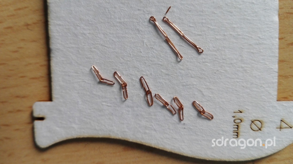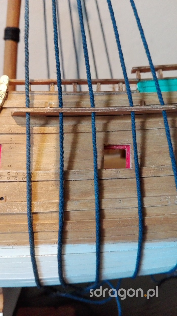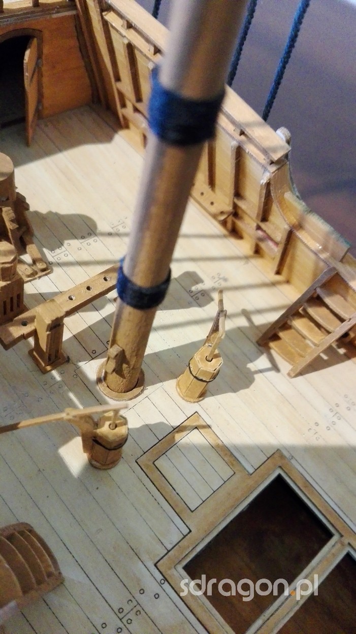 Po umieszczeniu masztu na odpowiednim miejscu, można rozpocząć prace nad olinowaniem. Na jednym ze zdjęć widzimy wanty przeciągnięte przez ławy na burtach. Liny te mają na celu stabilizowanie pozycji masztu względem osi okrętu. Do ich przymocowania do ław wantowych, wykorzystane będą jufersy oraz metalowe okucia widoczne na ostatnich zdjęciach.