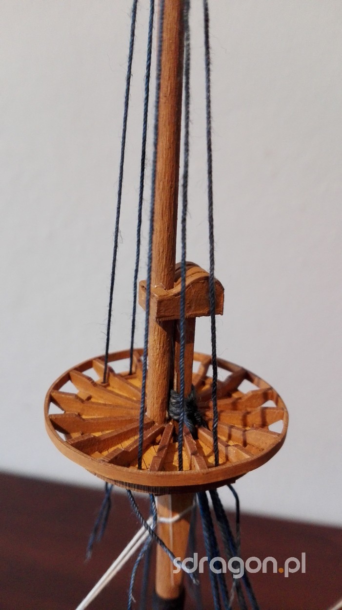 Nadszedł czas na rozpoczęcie prac nad olinowaniem modelu. Wykonany został jeden z masztów, który po pomalowaniu i wykończeniu znalazł się na swoim miejscu. Szczególnie ciekawym elementem jest pomost znajdujący się na łączeniu elementów masztu.